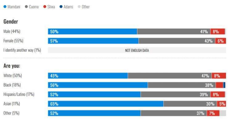Дополнительно были ещё был ряд интересных показателей. Наиболее популярным Мамдани оказался среди азиатов (одновременно увидел, что они составляют уже 11% населения Н-Й). А это, как мы знаем, в Америке самые успешные люди (по социальному положению, заработку, уровню IQ, отсутствию девиаций – «образцовые американцы» из их «мечты»).