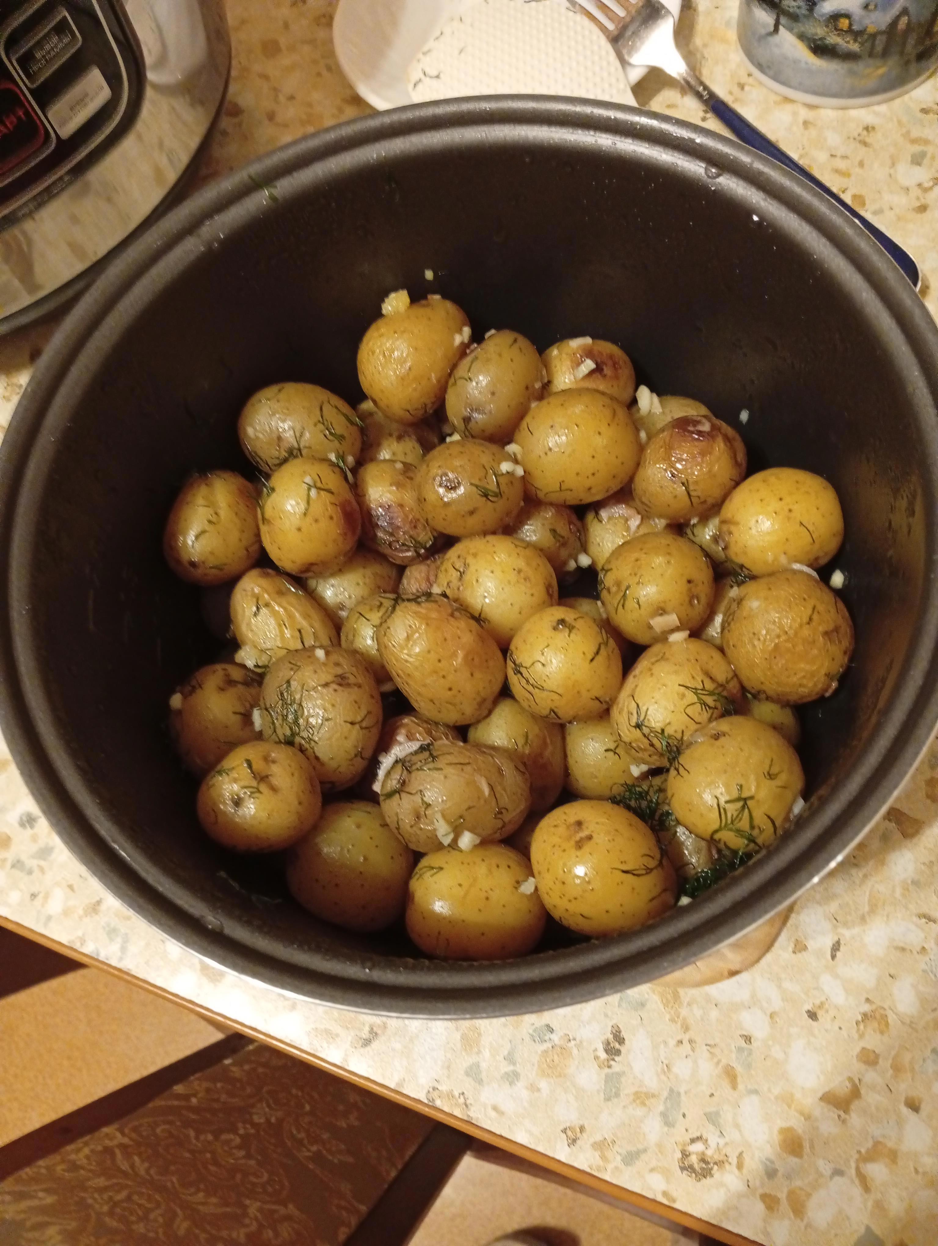 Килограмм картофеля моем, высушиваем, добавляем 1-1,5 столовых ложки растительного масла и 1-1,5 чайных ложки соли. Перемешиваем, выкладываем в чашу мультиварки, ставим режим "Выпечка" на 1 час. Через 30 минут перемешиваем. Когда готово и мультиварка перешла в режим поддержания тепла, мелко рубим 5 зубчиков чеснока и пару веточек укропа, добавляем к картошке, перемешиваем, оставляем на режиме 5-10 минут.
