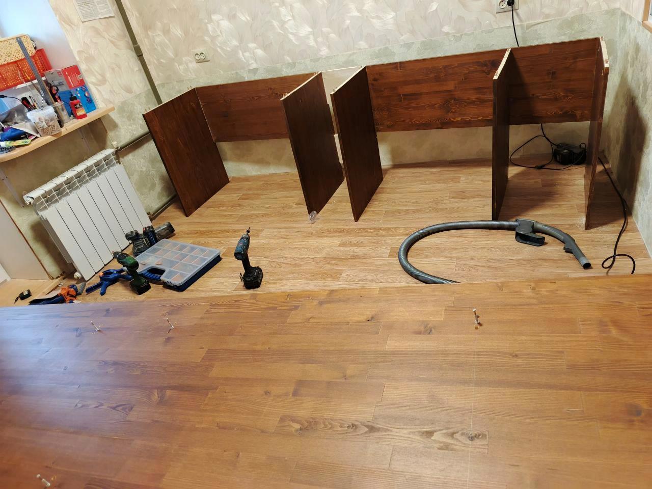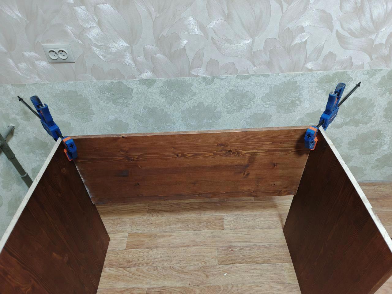 тут получается специальным приспособлением и специальной фурнитурой делают пазы, вдевают, склеивают, а потом ещё и прикручивают. Я на столе прыгала, чтобы все друг в друга вошло правильно.