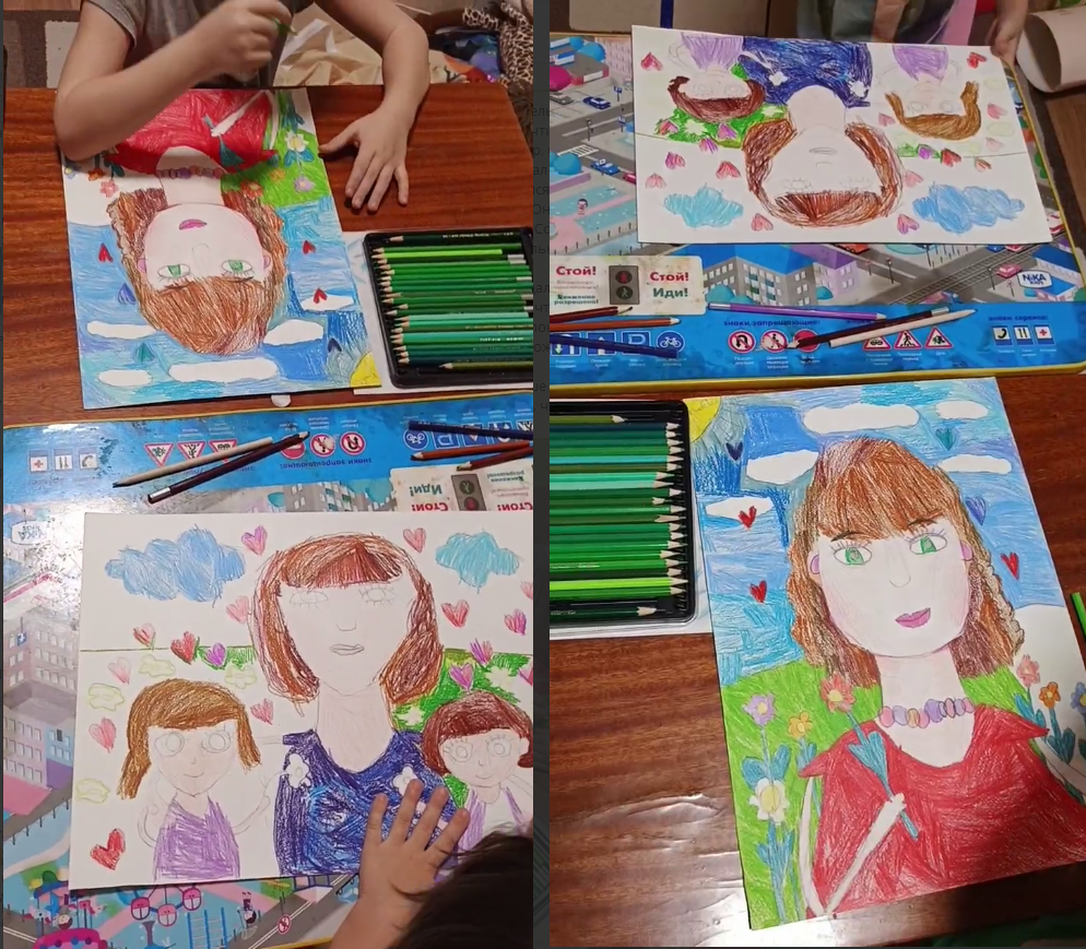 И самое первое: детки мои любимые дружно заболели и сидели дома, лечились и заодно их надо было постоянно кормить, развлекать и чем-то занимать (то есть делать всё то, что делают в садике). Сделали несколько заданий, которые высылали дистанционно. Выучили по стихотворению к скорому празднованию "Дня мам" и обе рисовали на конкурс рисунки на А3 опять же ко дню мам.