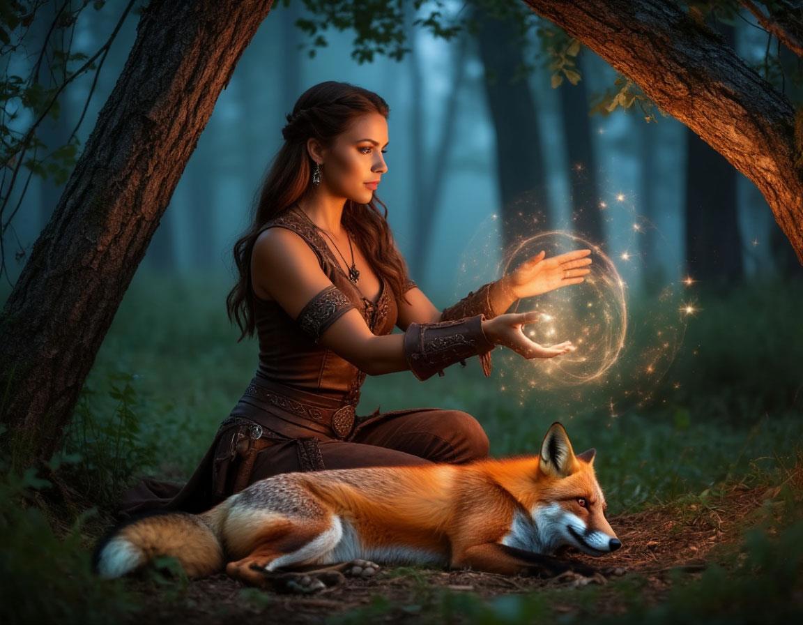 Может перенесемся в лес? В глухой чаще могут происходить удивительные события. Текст: «Фэнтези, крепкая загорелая женщина в средневековом охотничьем костюме держит руки навесу над лежащей лисой, от рук исходит сияние и волшебная энергия, вокруг магия, летний ночной лес, стелется туман».
