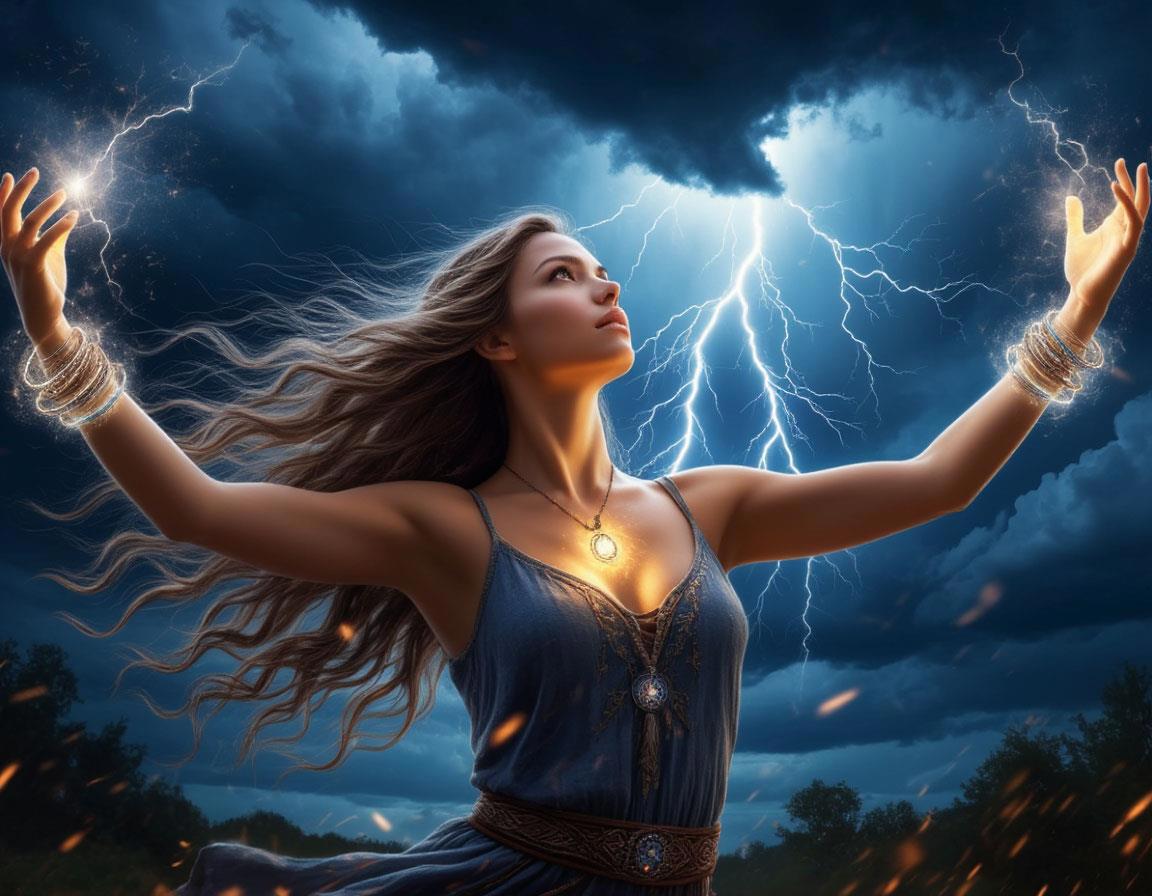 Попробовал дополнить: «Фэнтези, женщина с развевающимися волосами воздела руки к грозовому небу, на руках светящиеся браслеты а на шее светится кулон, она создает заклинание, с неба бьют молнии, вокруг сполохи магии, волшебная аура в воздухе, ночь, динамика, движение».