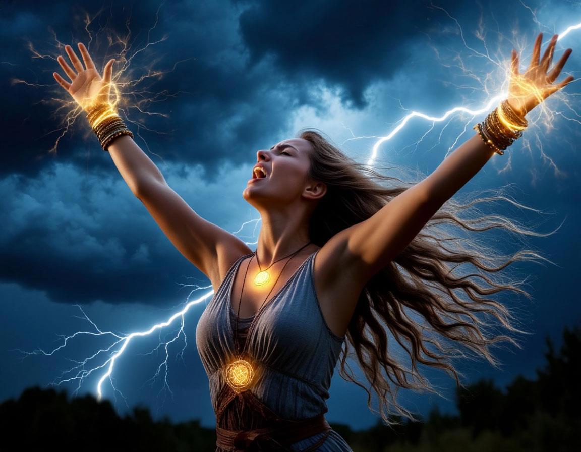 Добавил «и кричит» к запросу. Еще лучше. Но мне не понравился ракурс. В итоге: «Фэнтези, женщина с развевающимися волосами воздела руки к грозовому небу и кричит, на руках светящиеся браслеты, а на шее светится кулон, она создает заклинание, с неба бьют молнии, вокруг сполохи магии, волшебная аура в воздухе, ночь, динамика, движение, вид сбоку».