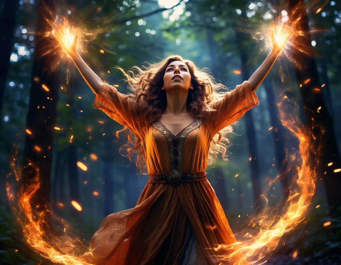 Поменяем сюжет. Запрос: «Фэнтези, женщина воздев руки к небу создает заклинание из ее рук бьют лучи энергии, вокруг магическая аура, сполохи огня, ночной лес, динамика, динамично».