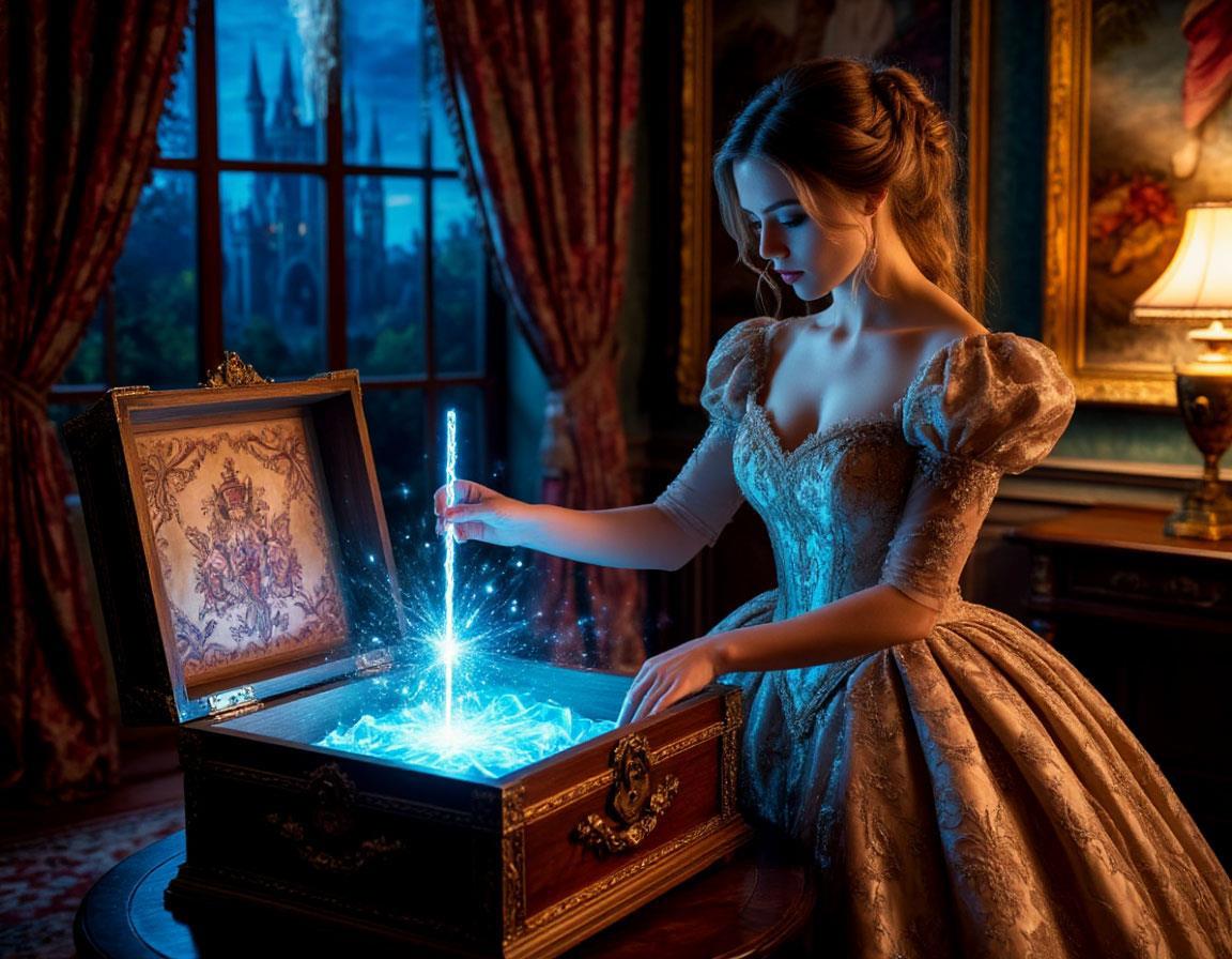Давайте сменим сюжет. Придумаем нечто спокойное и волшебное. «Женщина в роскошном платье достает из ларца волшебный светящийся жезл, от рук идет магическая энергия, комната замка, на стенах гобелены, за окном ночь».