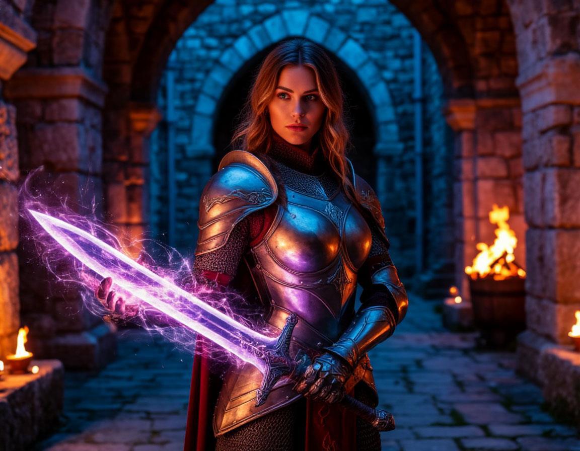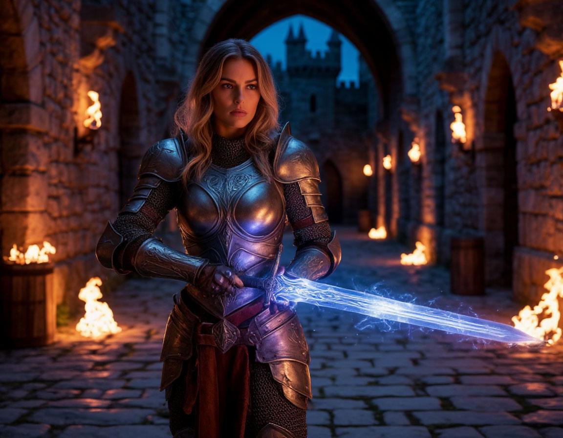 Запрос: «Фэнтези, сильная женщина в доспехах держит в руке волшебный меч который светится испускает ауру магии, вокруг каменный коридор замка, ночь, полумрак, горят факелы».