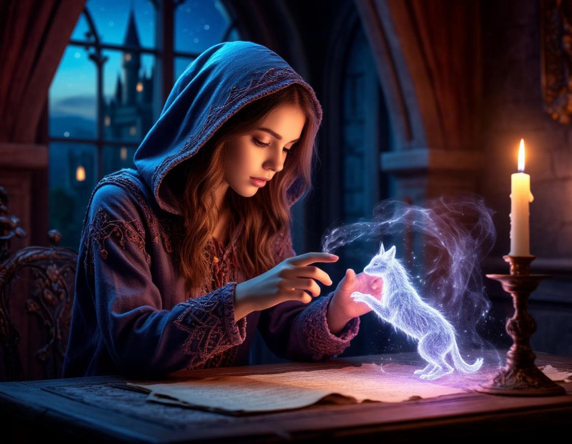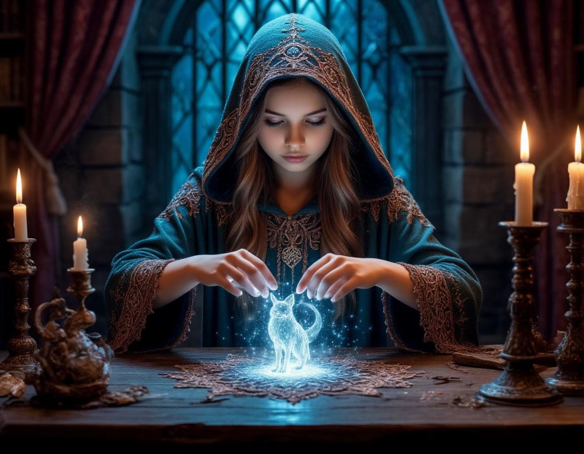 С помощью волшебной силы можно создавать существ и разные предметы. А еще влиять на живые и неживые объекты. Промт: «Фэнтези, сказка, красивая девушка в балахоне с орнаментом создает руками с помощью магии призрачную фигуру животного на столе, комната замка, свет старых светильников, вокруг магия, таинственность, ночь за окном».