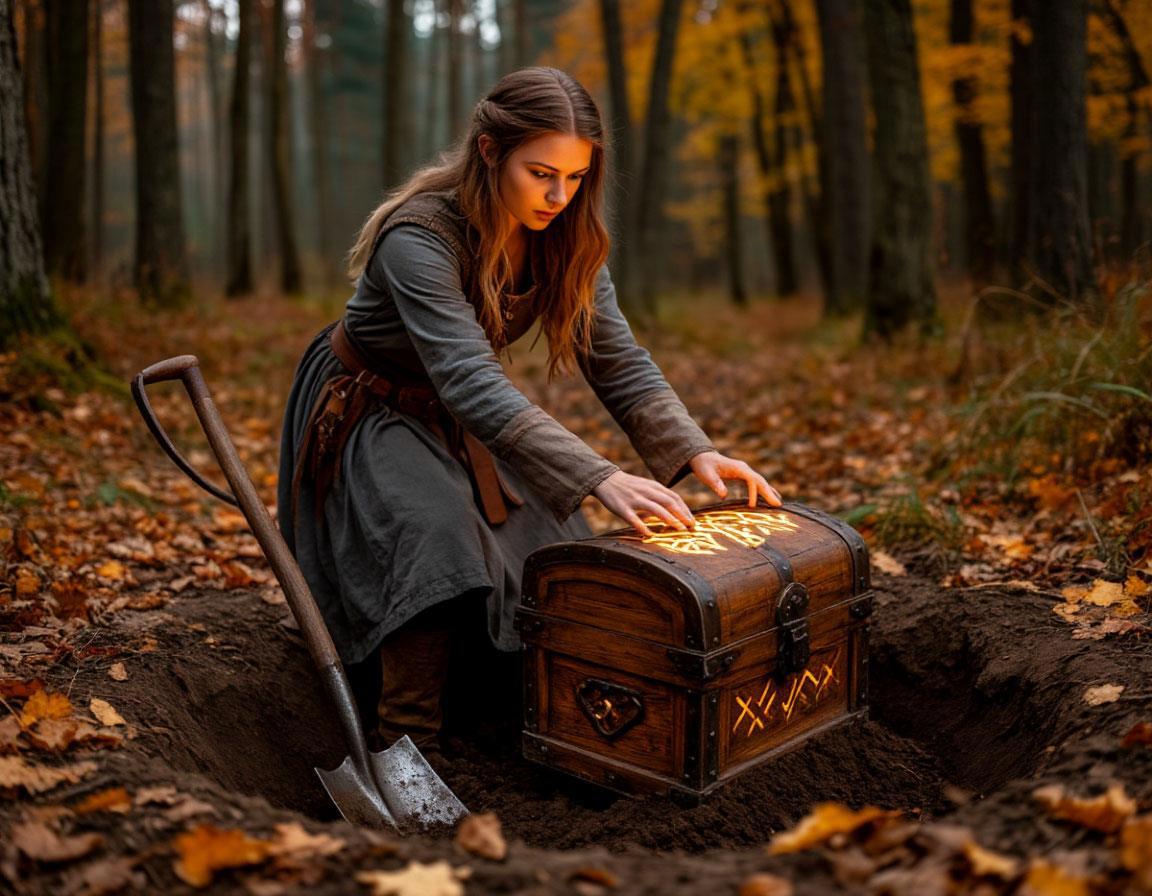 Кто же не любит клады и всякие сокровища? Запрос: «Фэнтези, крепкая девушка в дорожной средневековой одежде достает руками из ямы сундук со светящимися рунами, из земли торчит старая лопата, лесная опушка, вечер, осенняя природа».