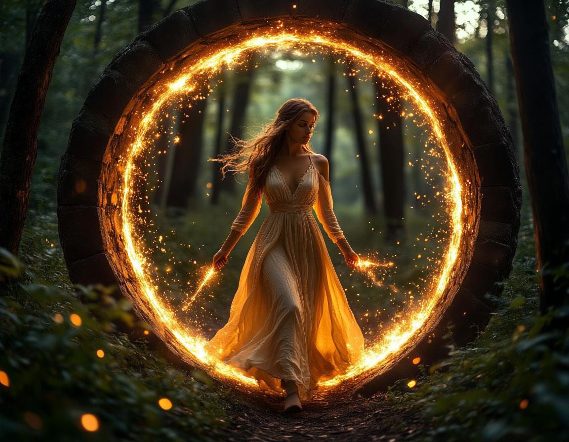 Но волшебство может не только разить врагов, но и приносить жизнь. Или помогать в дороге. Запрос: «Стиль фэнтези, женщина выходит из круглого магического тоннеля, делает шаг, в руках у нее волшебный жезл, вокруг сполохи магии, искры, вечер, летний лес, вид спереди, видно лицо, динамика».