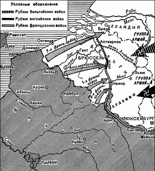 Что нужно понимать? Что союзники ожидали удара в обход основных укреплений через территории Бельгии и Голландии. И все их планы заключались в том, чтобы быстро войти на территории Бельгии (захватив заодно кусочек Нидерландов) - и, заняв удобные оборонительные рубежи по берегам рек и каналов, измотать вермахт в жёсткой обороне. Попутно вынудив немцев к капитуляции экономической блокадой... И голодом на ближайшую перспективу.