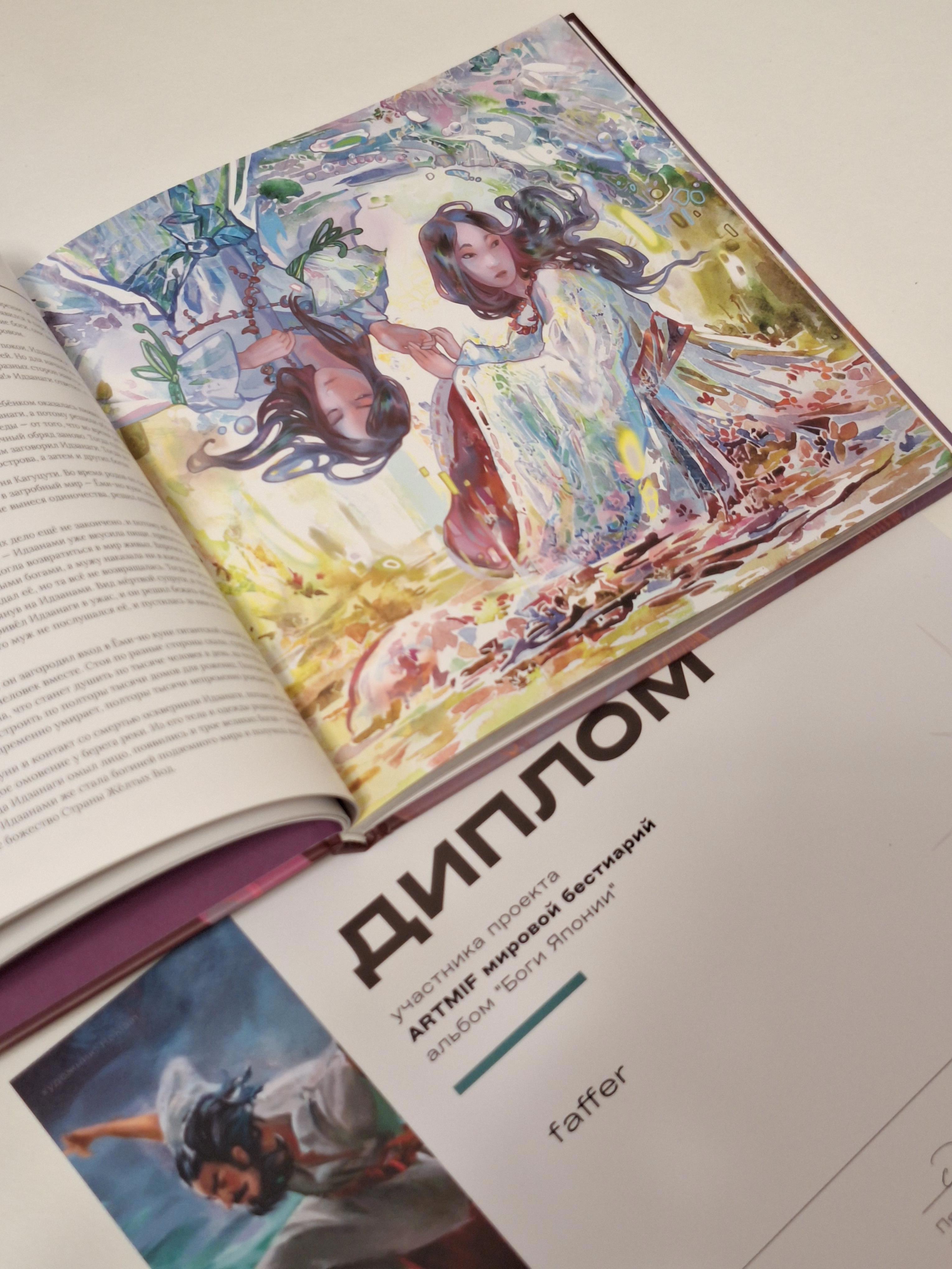 К подруге наконец приехал авторский артбука с моей картинкой. Картинка очень неудачная, как по мне, азиатскую эстетику я вообще не очень люблю, и естественно мне за это не платили, но участвовать было классно, и, наверное, теперь буду ходить туда, пока не выгонят, ахахах