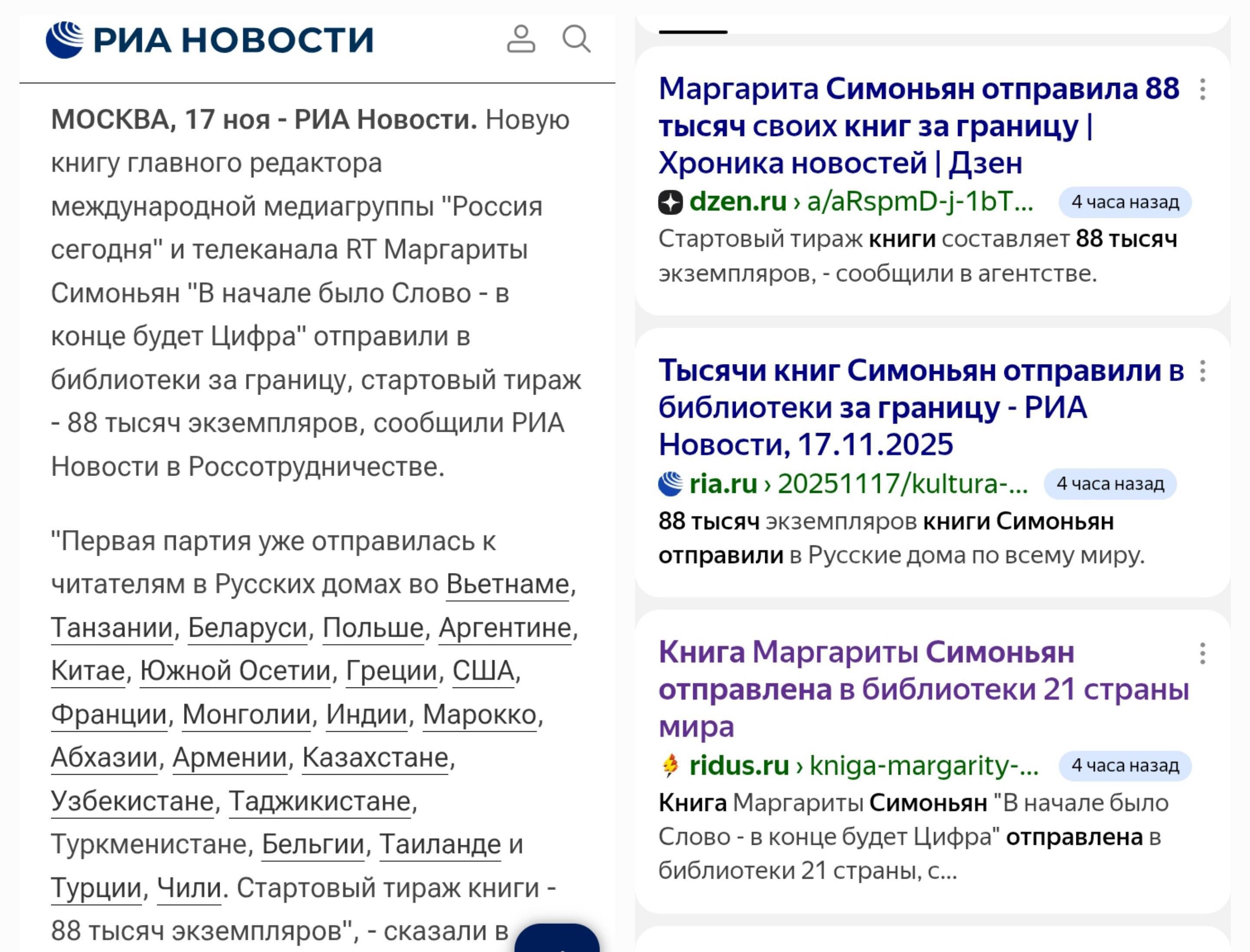 Рис. 2. Все те же издания радостно рапортуют, что тираж 88 тысяч - уехал за границу. 17.11.2025.