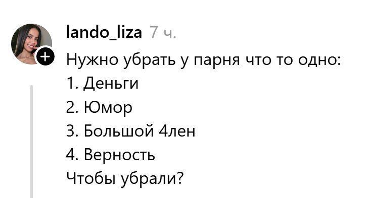 Автор: Irina UrbinaВсегда ржу с этого повсеместного теста в соцсетях. Здесь нет никакой сложности для любой адекватной женщины. Убирать надо большой член. Потому что он - не предмет вожделения, а предмет боли. А то что вам в порнах показывают, ну, ребят, это и монтаж, и ловкость и умение актёров, и вааще. Потому что многие стыдливо молчат, что порноактёры имеют свои травмы. Да и глубина вагины в возбуждённом состоянии составляет всего 13, ну, максимум 14-15 см. То есть сопоставима с обычным среднестатистическим размером члена. Такие дела.
