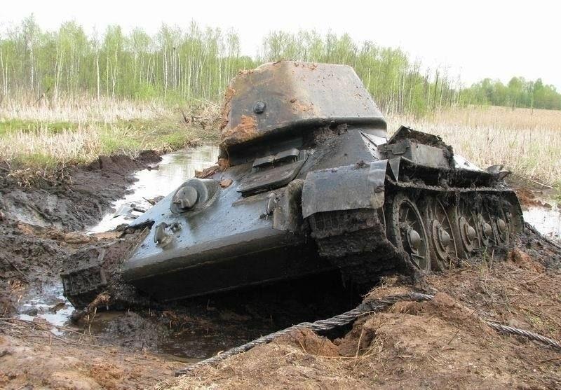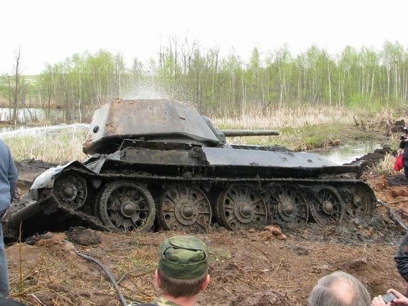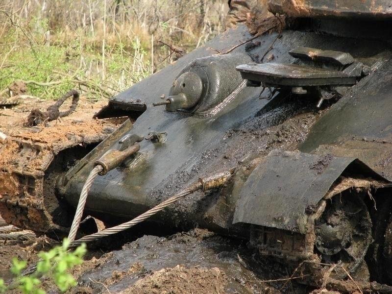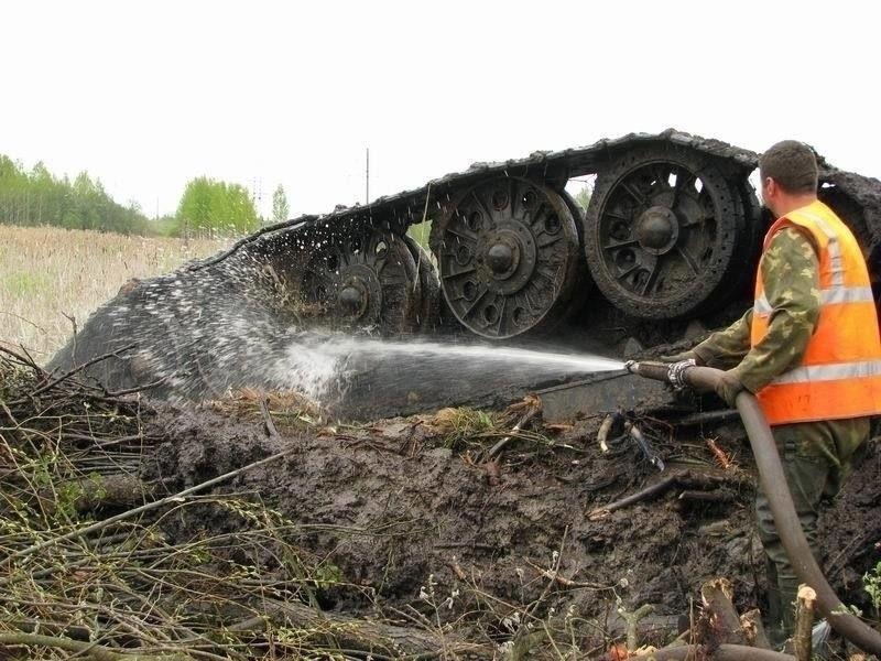Гул, натянутых как струны, тросов был слышен даже сквозь рёв бульдозеров. В пятидесяти метров от берега ломаются молодые березки. 27-ми тонная машина медленно ползет по дну болота, увлекая за собой все, что попадается ей на пути. Даже после 67-ми лет проведенных под водой, танк остается танком.