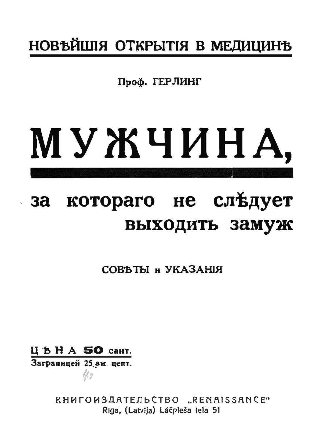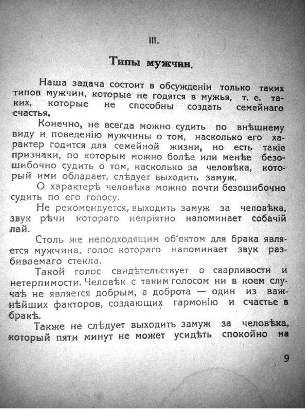 Автор: Сурина ОльгаНаткнулась как-то на одно пособие 1930 года «Мужчина, за которого не следует выходить замуж. Новейшие открытия в медицине».