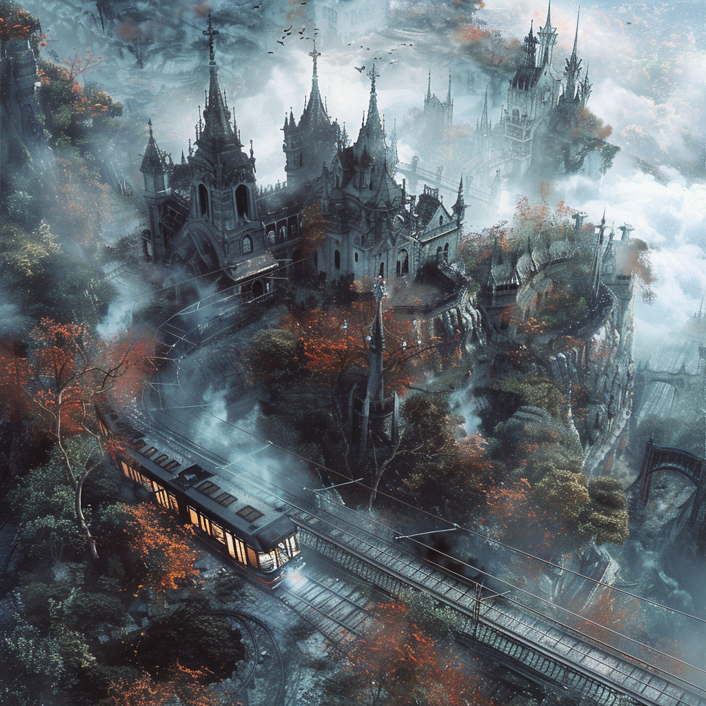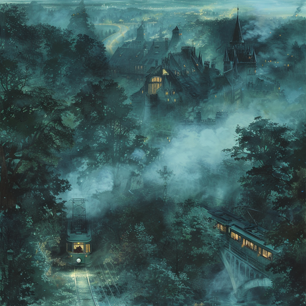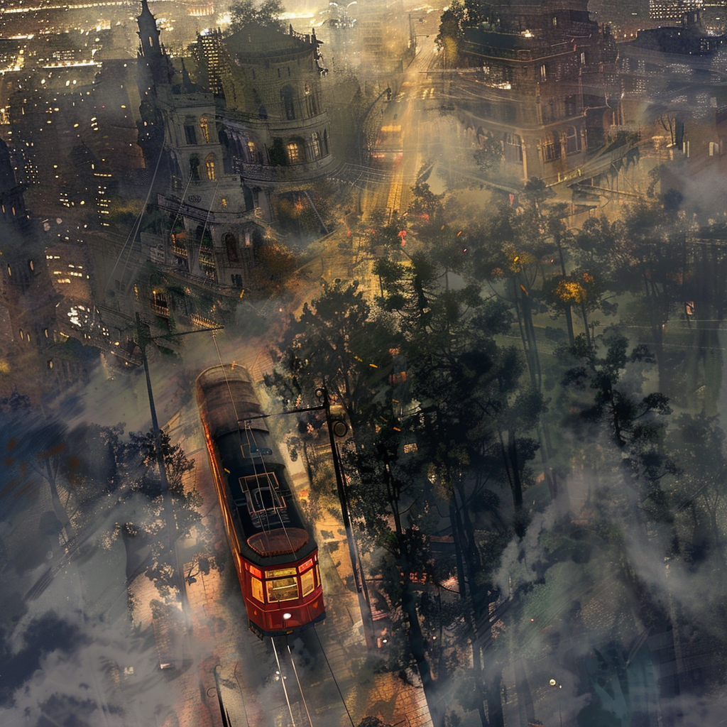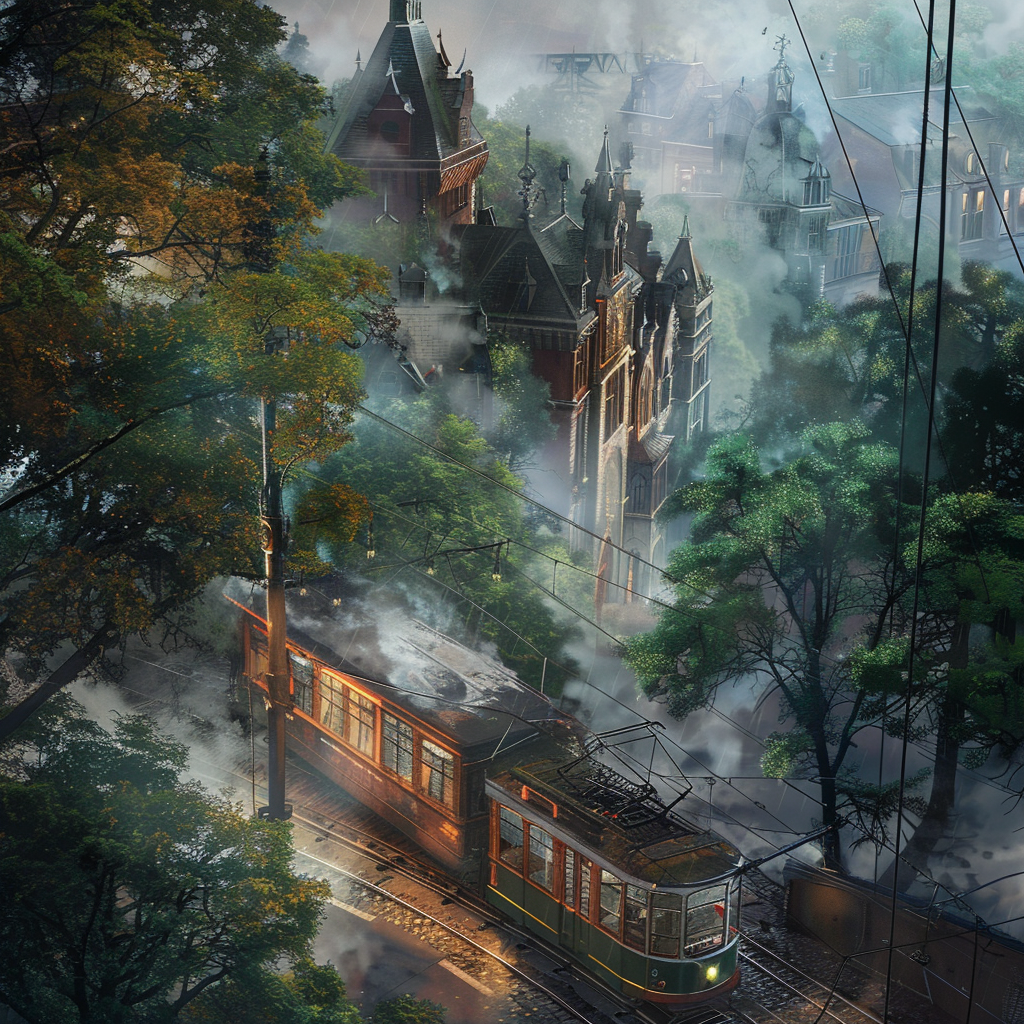 bird's-eye view, fairy-tale city, tram, trees, fantasy, ghostly, realistic, mysticism, dynamics, wisps of fog, detailing, drawing, art, gothic, kaleidoscope
