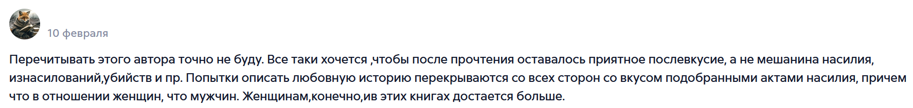 Во-первых, ломаю голову: что же это за книгу товарищ прочитал, в которой все это нашел, да еще в таких концентрациях? Отзыв оставлен не к определенной книге, а на странице автора в Литресе, так что теряюсь в догадках. На мой взгляд, единственная книга, которую можно было бы за это поругать, лежит в столе (ну ладно, висит в недрах компьютера) неопубликованная с давних-предавних времен. Но её по очевидным причинам автор отзыва прочесть не мог.