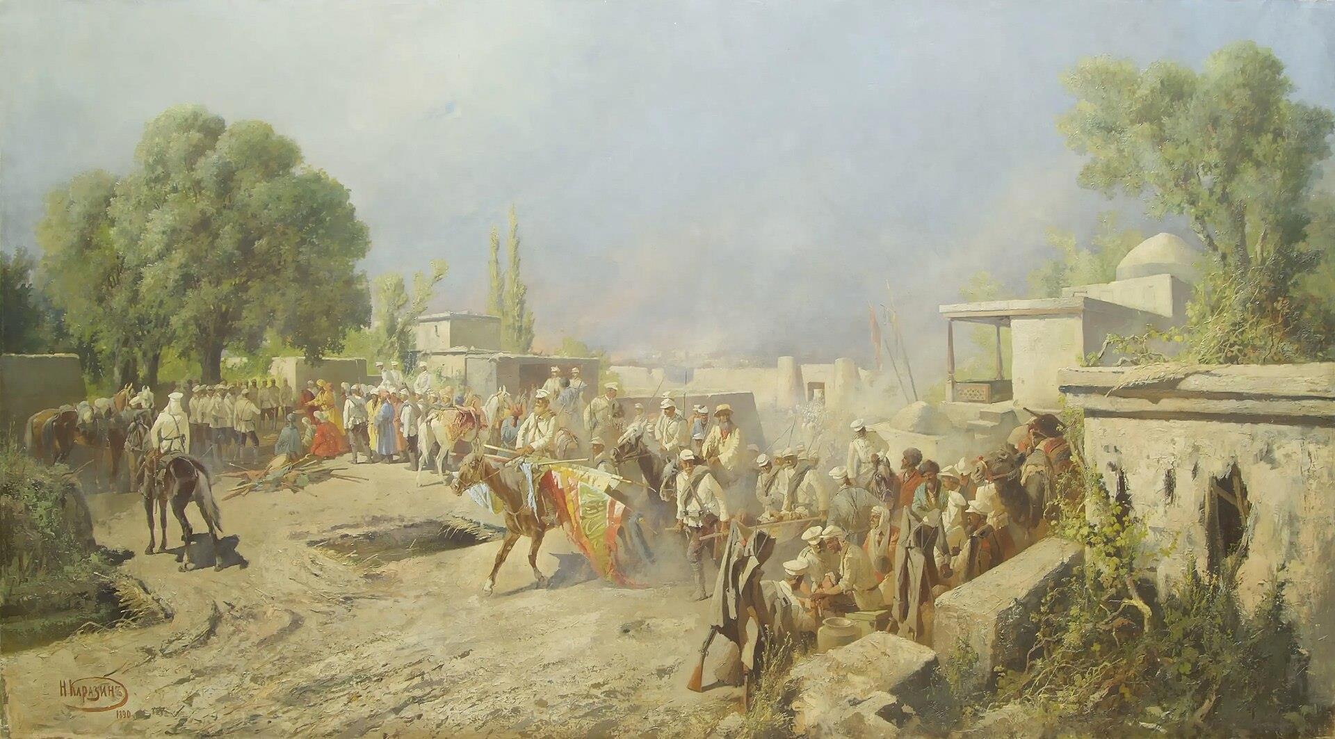 В 1865 году взят Ташкент, завоевание Средней Азии идёт полным ходом, русские берут город за городом