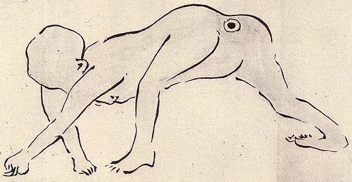 Цитирую: «Вариант легенды о нём существует всего один. Якобы некий самурай когда-то ночью следовал по дороге к Киото и внезапно услышал, как кто-то просит его остановиться и подождать. Обернувшись, самурай увидел скинувшего с себя одежды человека, продемонстрировавшего ему свой зад, где вместо анального отверстия находился огромный глаз. Самурай в ужасе убежал»
