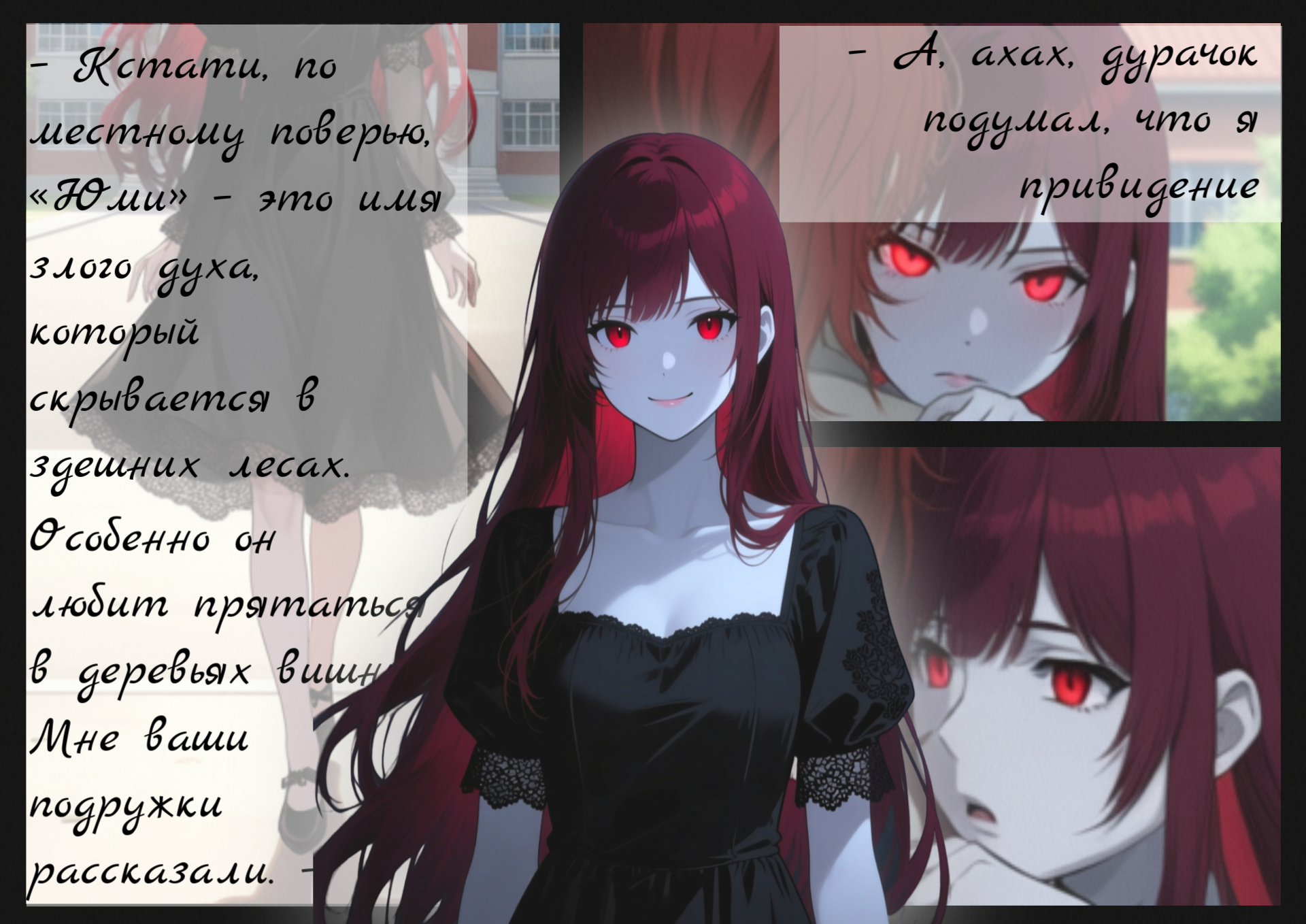 – А, ахах, дурачок подумал, что я привидение, – хихикнула девушка. И с этим смехом запах ладана с железом вдруг исчез. – Кстати, по местному поверью, «Юми» – это имя злого духа, который скрывается в здешних лесах. Особенно он любит прятаться в деревьях вишни… Мне это ваши подружки рассказали.