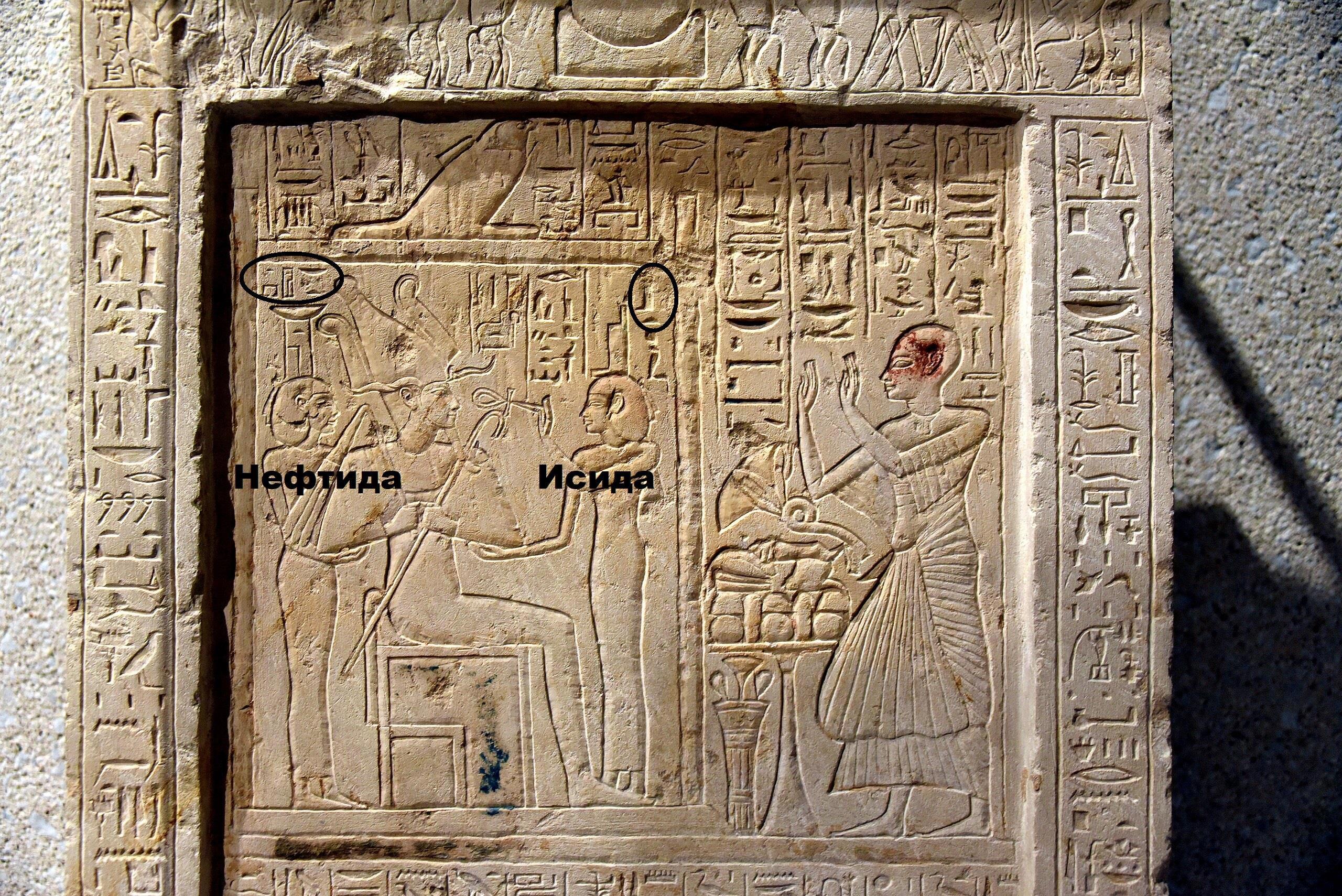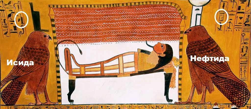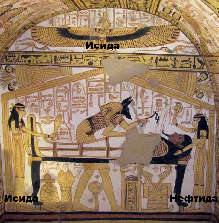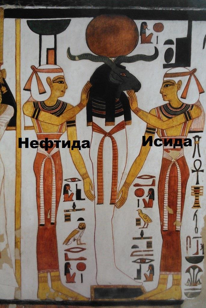 Ещё раз. Женщина с троном на голове – Исида, женщина с прямоугольником и полукругом на голове – Нефтида.