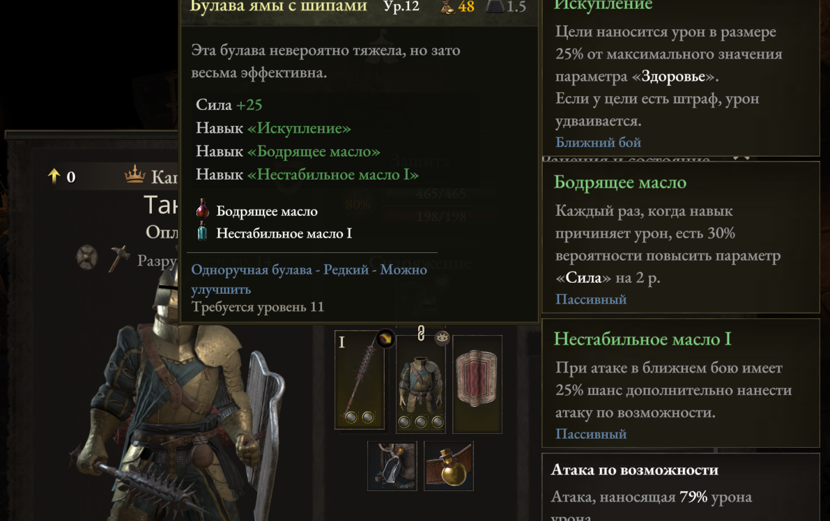 Вот тут булава ямы с шипами дает возможность ударить на 50% от макс хп противника. А если будет крит, то гарантированно ваншотит любого врага. Независимо от количества здоровья.