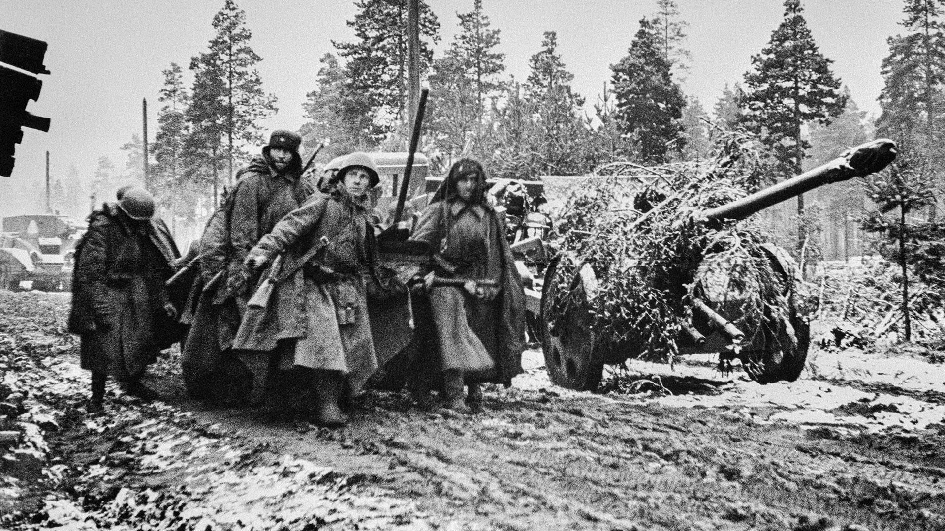 Бойцы везут замаскированную дивизионную пушку Ф-22 по размытым дорогам, 1 ноября 1941 г., Ленинградский фронт. Фотография В. С. Тарасевича.