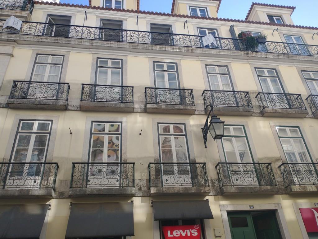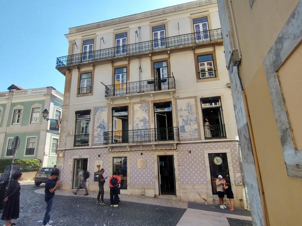 Здание выполнено в классическом португальском стиле с несколькими этажами, балконами и декоративными чугунными перилами.