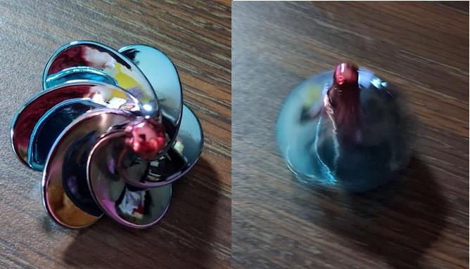 Жена не смогла удержаться, и мы купили яркий маленький "дутьевой" волчок. Пока он лежит - это ещё ничего, но если на него подуть, то начинает очень быстро крутиться.