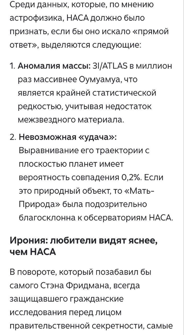 Позже Гарвардский астрофизик Ави Лёб назвал происходящее “самым интригующим явлением последних лет”. По его словам, струи и выбросы, зафиксированные в разных наблюдениях, ведут себя слишком организованно, будто стабилизируются или управляются. Если комета вращается, её выбросы обычно размываются и создают нерегулярный след, но в случае с 3I ATLAS линии остаются устойчивыми. Лёб не исключил, что “это может быть физика, которую мы ещё не понимаем, или результат искусственной конструкции”.