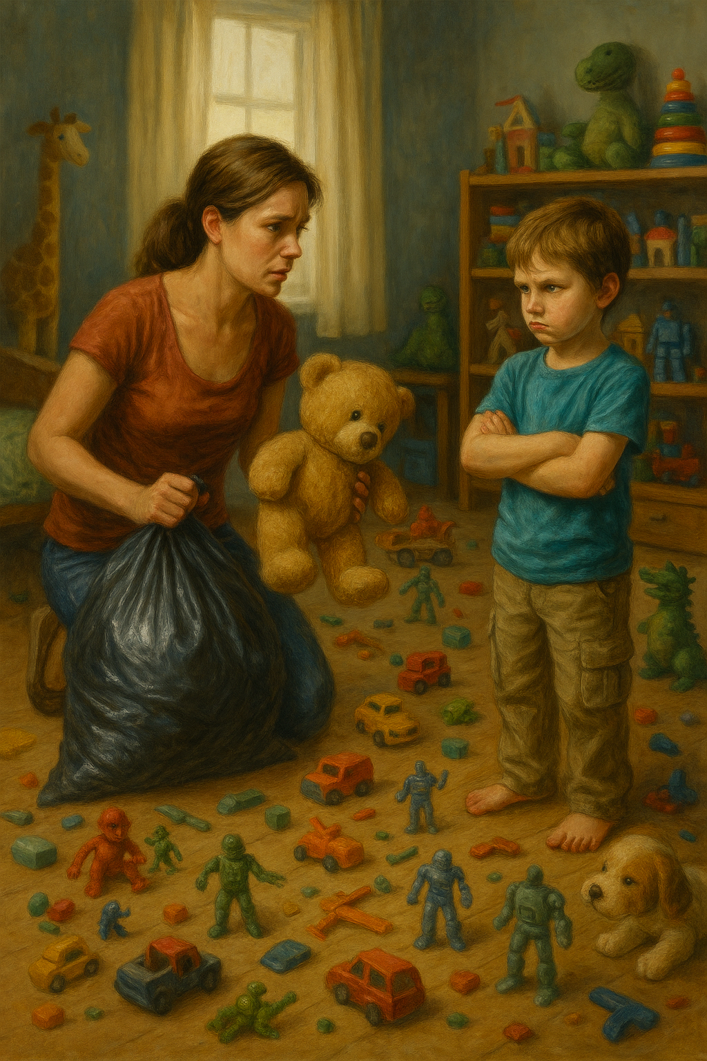 Ситуация всегда начинается одинаково. Ты смотришь на полку, где стоит плюшевый динозавр без головы, машинка без колёс и кукла, в которую вложено столько жизненной мудрости, что она выглядит как свидетель криминальной драмы. Ты берёшь пакет, вдохновляешься марафонами «разгружаем дом», и тихонечко пытаешься забрать хотя бы вот это, потому что оно уже пятый год живёт жизнью археологического экспоната.