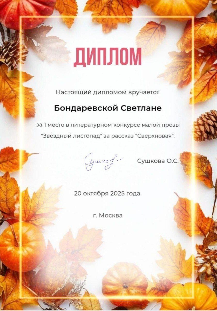 в октябре 2025 года "Сверхновая" заняла первое место в литературном конкурсе малой прозы "Звездный листопад". Конкурс проводился Ольгой Сушковой автором фэнтэзи на ее ТГ канале