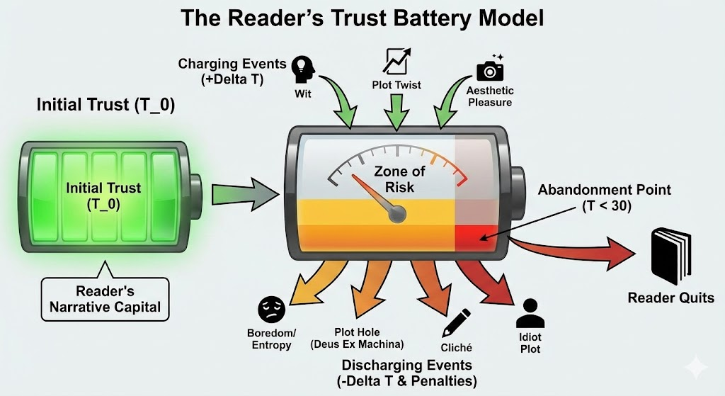 Взаимодействие «Автор — Читатель» описывается экономической моделью «Батарейки Доверия» (Trust Battery). Доверие — это исчерпаемый ресурс, расходуемый на поддержание «подавления недоверия» (suspension of disbelief).