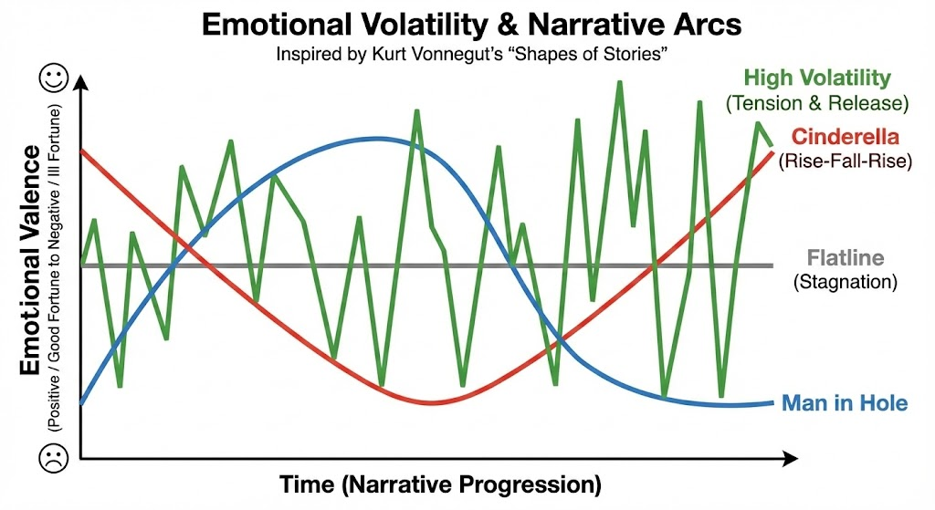 Современный сентимент-анализ подтверждает гипотезу Курта Воннегута о том, что истории имеют геометрическую форму. Предиктором удержания внимания служит Эмоциональная Волатильность (Sentiment Volatility).