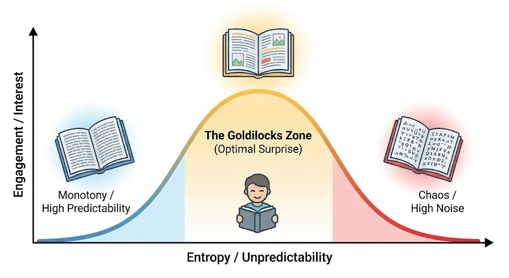Задача автора — удержание текста в «зоне Златовласки» (оптимального уровня сюрприза по Шеннону), балансируя между узнаваемостью паттернов и новизной.