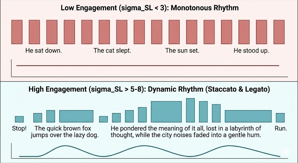 - Высокая вовлеченность (sigma_SL > 5–8 слов): Динамическое чередование коротких (стаккато), средних и длинных (легато) периодов управляет скоростью чтения и дыханием читателя.
