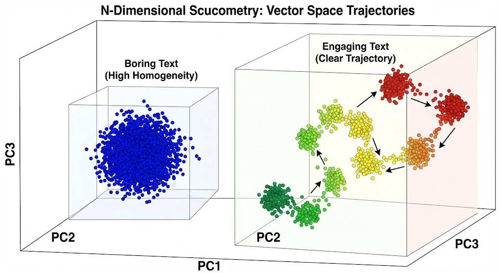 При векторизации предложений можно измерить дисперсию смысловых кластеров. Скучный текст в N-мерном пространстве характеризуется высокой гомогенностью. При визуализации через метод главных компонент (PCA) он выглядит как плотное, неподвижное облако точек.