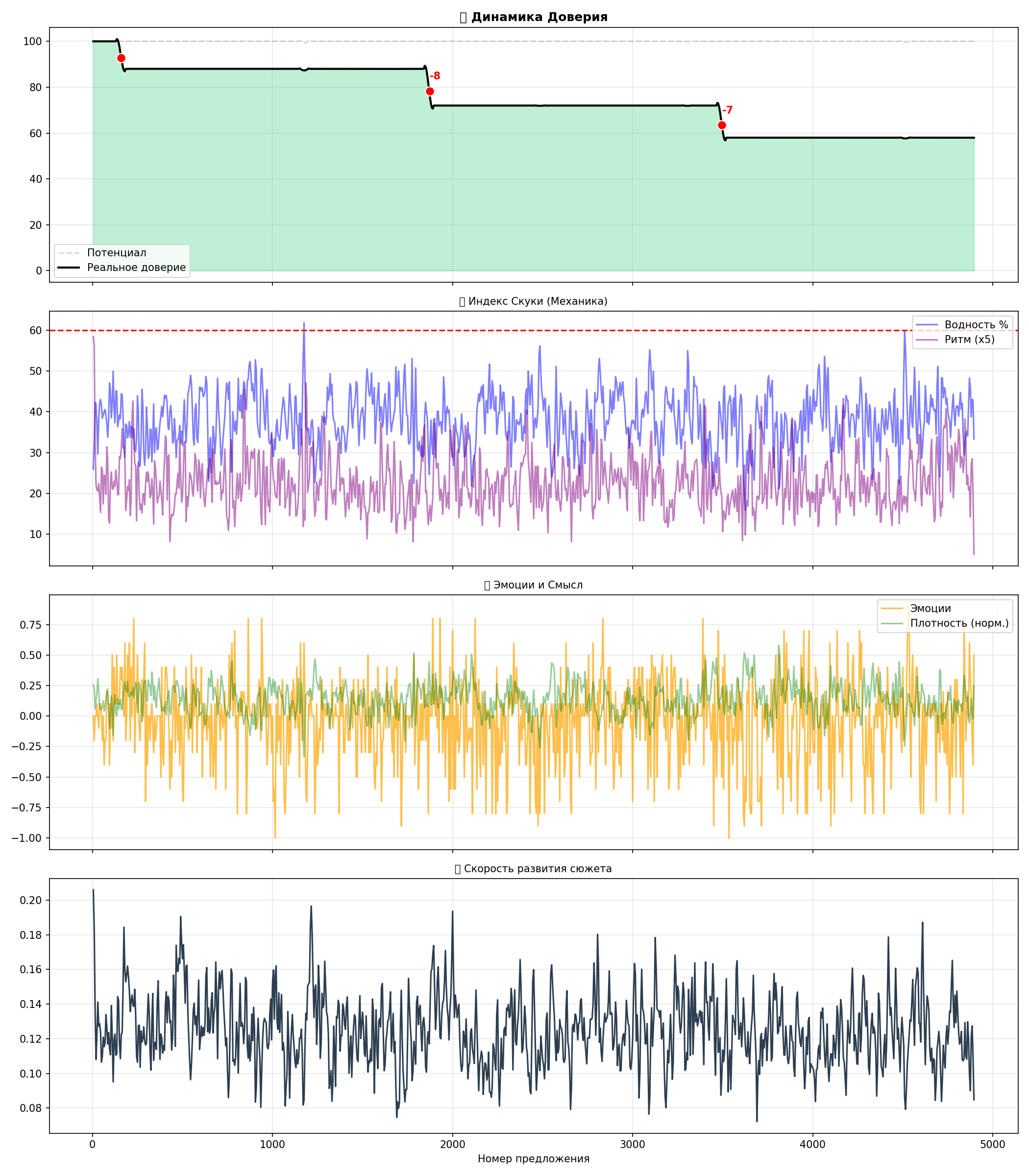 С точки зрения нейрофизиологии, «скука» и «раздражение произволом» — это факторы, прерывающие состояние потока (Flow State) и активирующие сеть пассивного режима работы мозга (DMN). Предложенные методы — от анализа sigma_SL до векторизации сюжетных дыр — позволяют перевести жалобы на «плохой текст» из области вкусовщины в строгую, диагностическую науку о качестве информации.