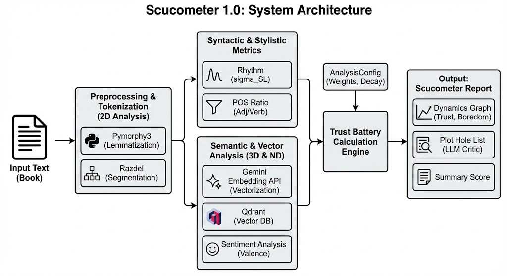 Для проверки теоретических выкладок был разработан программный прототип «Скукометр 1.0». Алгоритм объединяет классический морфологический анализ и нейросетевые технологии для построения единого графа читательского доверия. Ниже приведена логика работы системы.