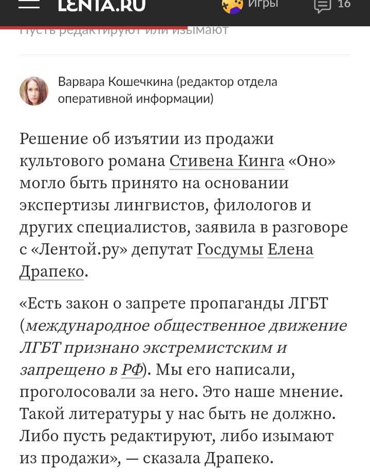 "...такой литературы у нас быть не должно", - откомментила решение Ромкомнадзора актриса Елена Драпеко. Ныне депутатка.