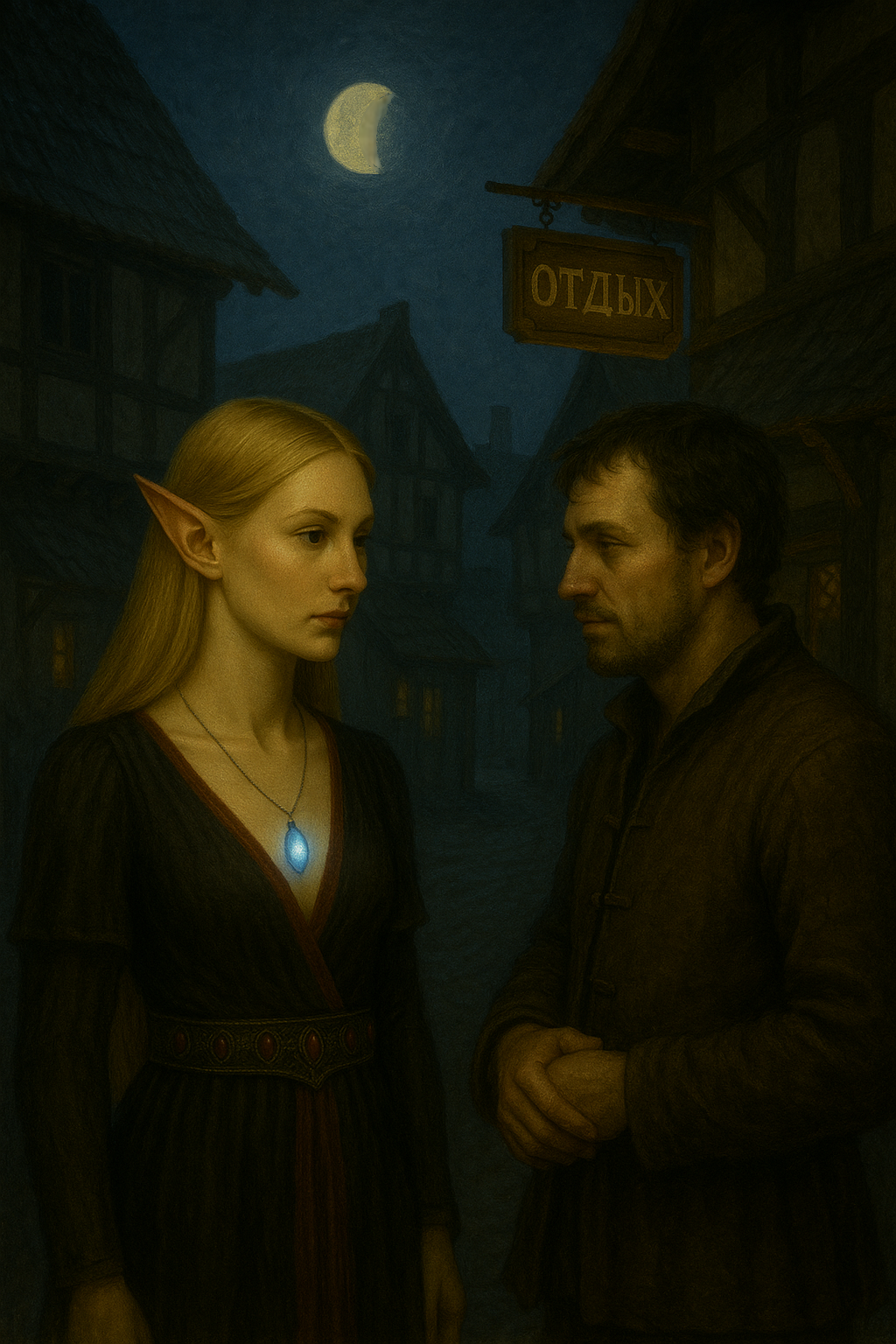 Снаружи тем временем ночь вступила в свои права, укутывая Новобережье холодной и тихой тьмой. Айриль, стоя в тени низкого дома напротив постоялого двора, смотрела на зажигающиеся звёзды. Слабый свет луны отражался от её светлых волос. Она насвистывала весёлую мелодию, чтобы успокоить нервы, время от времени подбрасывая в руке мелкий камушек.