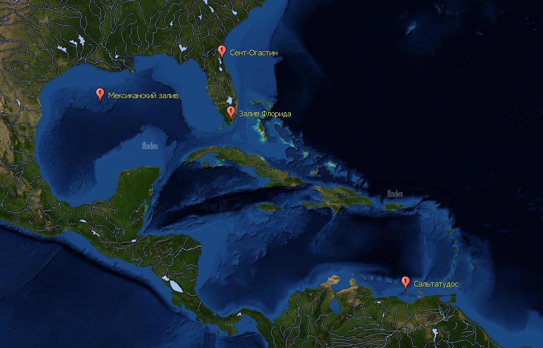 Карта к приключениям каперов и подписями к тем местностям, которые они назвали. (Отрисовано в SAS.Планета)