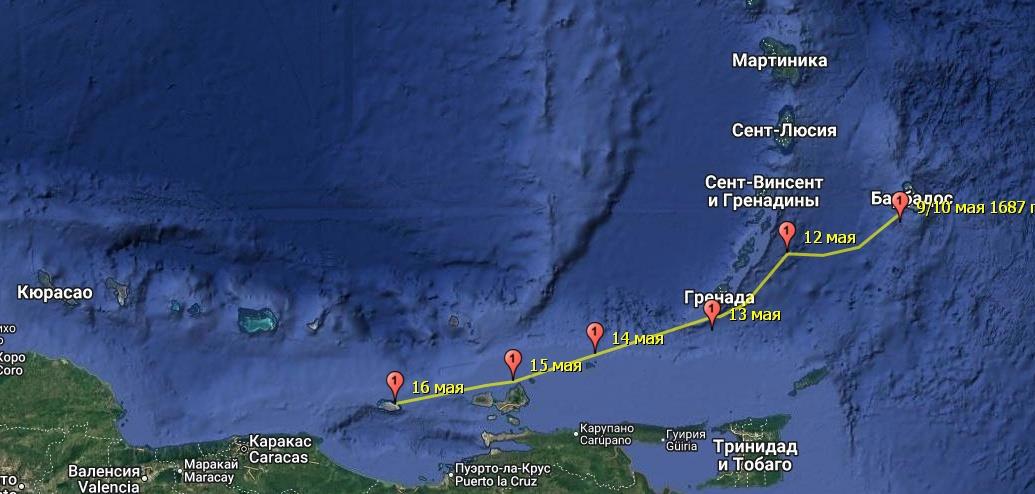 12-го мая этим утром, несмотря на то что мы шли курсом зюйд-вест, чтобы обогнуть Великую Гранаду, течение снесло нас так сильно к норду, что мы определили, что [острова] Гранадильос (ориг: Granadilioes [Группа мелких островов к северу от Гренады. – прим.]) находятся к весту от нас, что вынудило нас лечь на более южный курс, чтобы обогнуть Великую Гранаду.