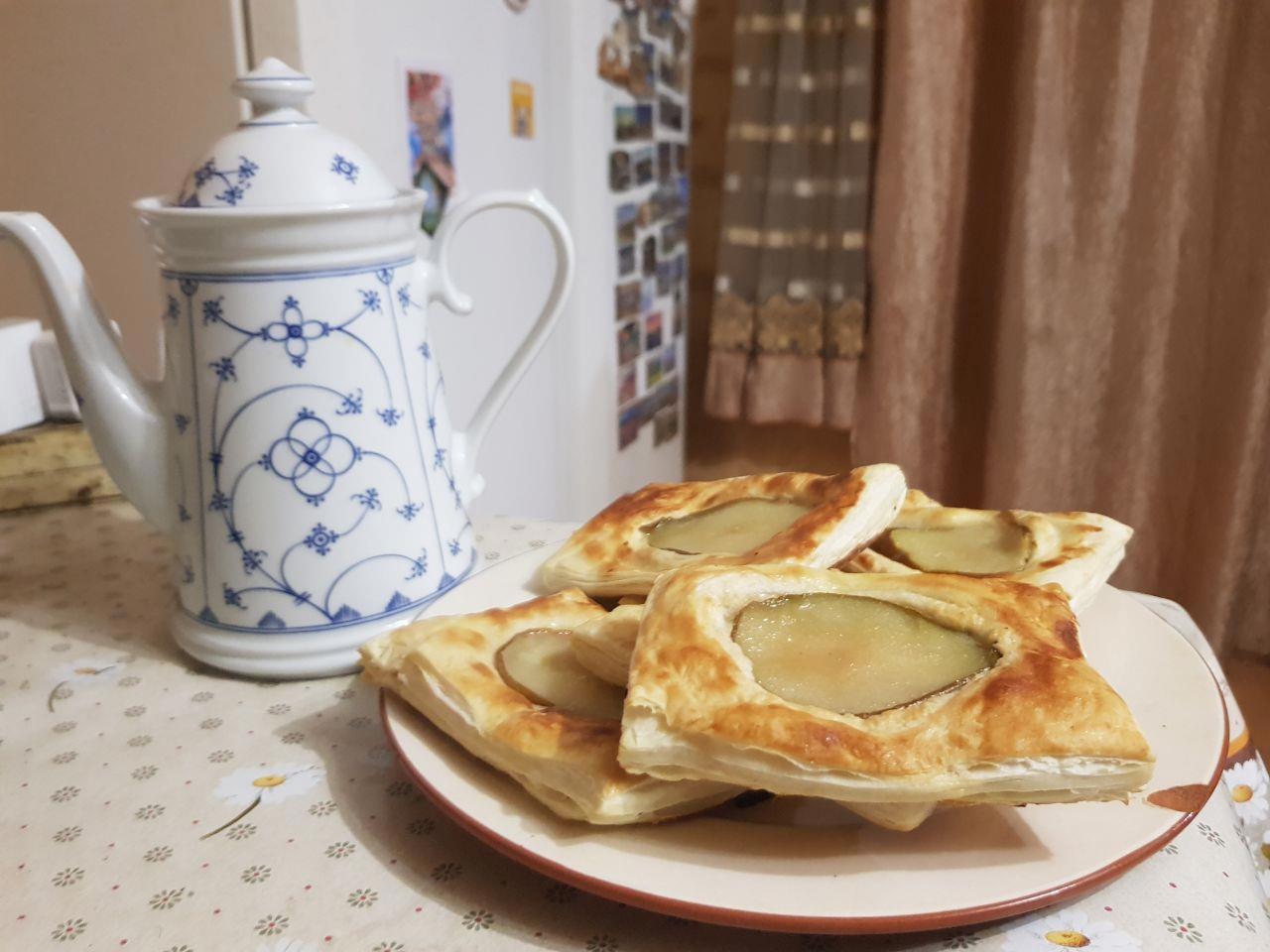 ...Но вечером не успели даже покупное раскатать и груши нарезать. А за ночь покупное тесто разбухло в пакете, чуть пакет не лопнул. Написано, что "слоеное", а разнесло как дрожжевое. Обычно я не весь пакет использую, ну а тут уже нельзя было ждать без электричества, кто там знает, может еще несколько часов и таинственное тесто займет весь холодильник. Поэтому и не все с грушами, кое что с яблоками...
