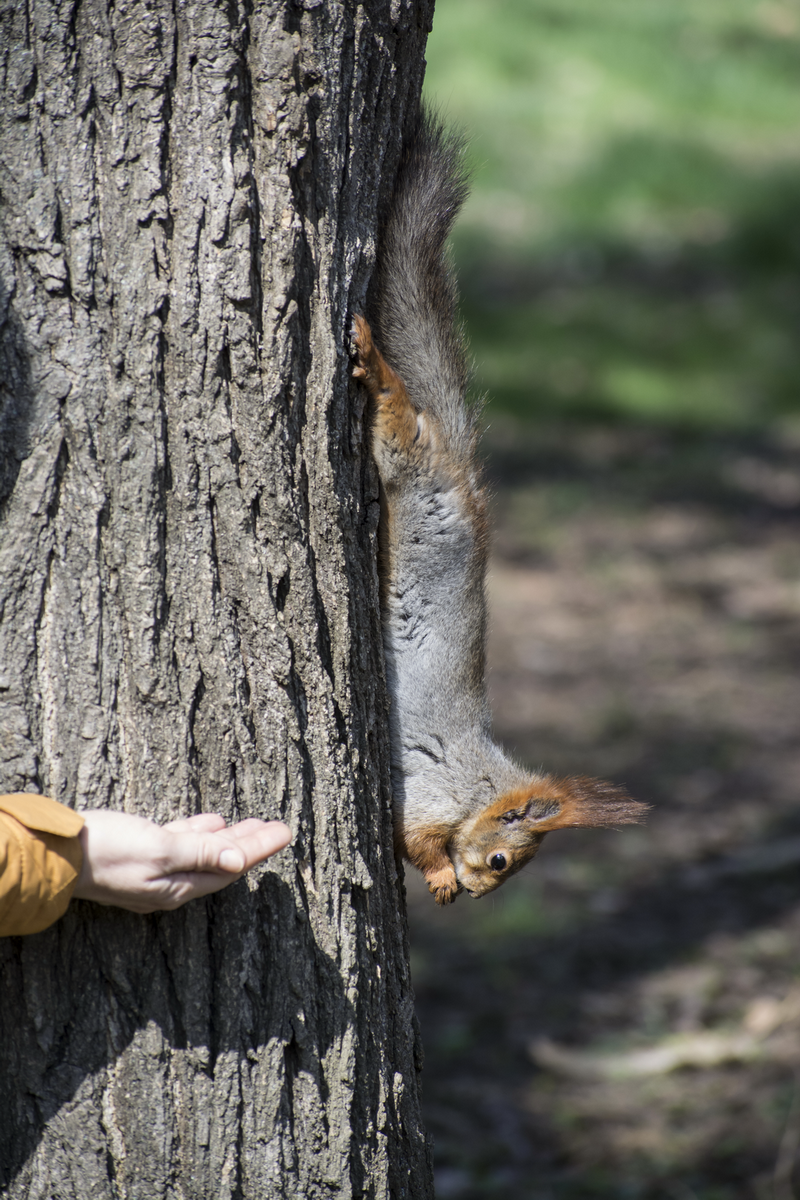 Но уже и многие деревья полностью сбросили листву, а белочки сменили рыжую шубку на зимнюю, серенькую. И прыгать по веточкам без листьев они явно отвыкли.