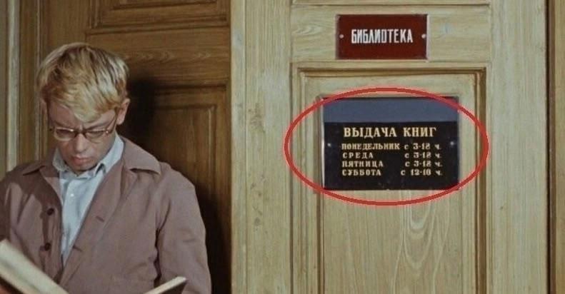На двери библиотеки, куда заходил Шурик за книгами, висит вывеска.