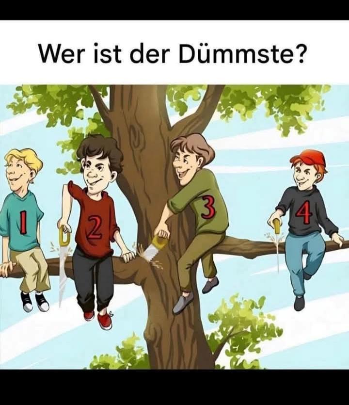 Итог: картинка неоднозначна, но при варианте, который ты предложил (3 пилит с обратной стороны), наиболее логично назвать №2 «самым глупым», потому что он прямо подпиливает часть ветки, где сидит (и ставит под угрозу и себя, и №1).