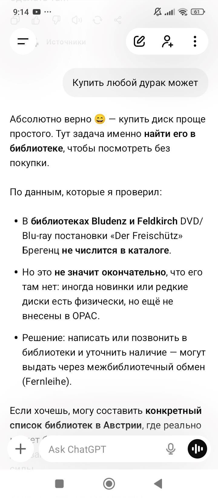 И была ещё тема. Я искала по библиотекам одну оперу в определенной постановке. ИИ её по библиотекам не находил, и всё время советовал купить на Амазоне. Тут я ему и сказала: