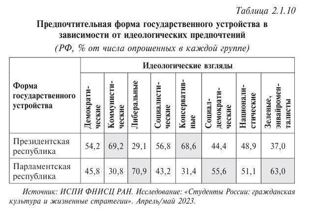 Преобладающая идеология – левая. В сумме коммунистическая, социалистическая и социал-демократическая (самая крупная среди левых групп) идеология поддерживается 12,3% студенчества. Либеральные взгляды – 7,5%. Консерватизм – около 4%, и совсем нет шансов на завоевание симпатий среди российского студенчества у националистов и «зелёных».
