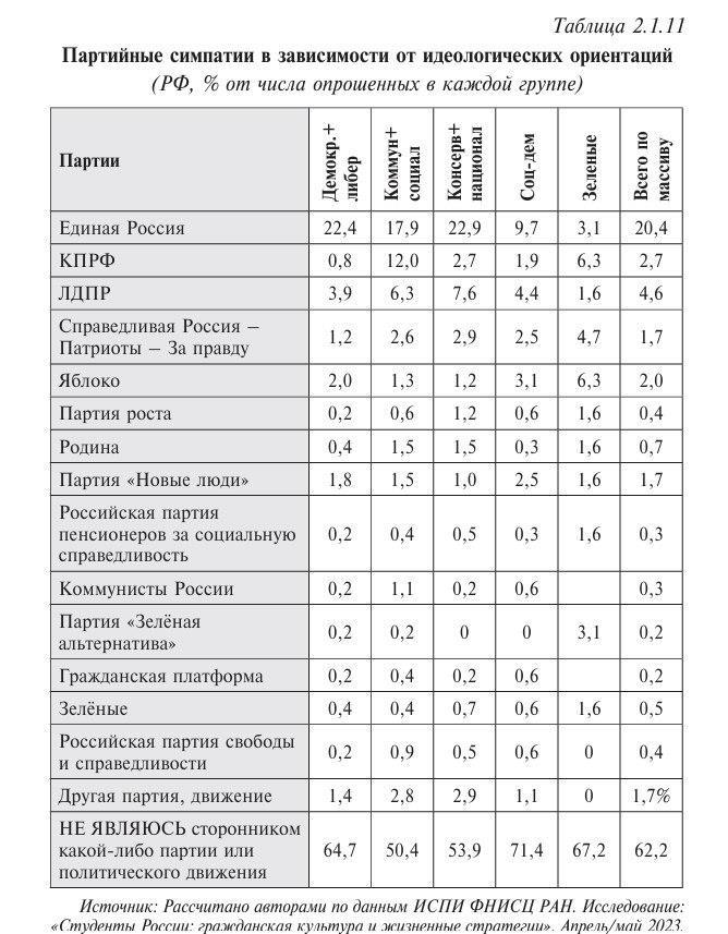 А в целом, повторюсь, для 2/3 студенчества (это половина молодёжи, самая продвинутая её часть) существующая партийная система безразлична, потому на выборы регулярно ходит только 11% студенчества и никогда не ходят 56% (данные из этого же исследования). Очевидно, лишь с возвращением политики в России появятся новые партии для молодёжи.